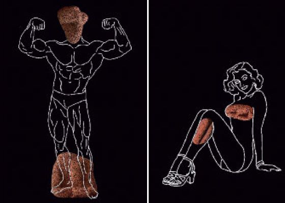 Fragmentos de cerámica pertenecientes a dos idolillos. Reconstrucción del aspecto original según documentación extraída de publicaciones de época, conocidas como «revistas del corazón»