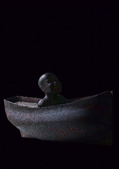 Embarcación de madera a escala con busto de un joven nubio vociferante. Posible función funeraria