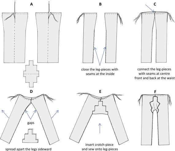 Las prendas que nos interesan están hechas de 3 piezas, y se usó el mismo hilo y las mismas fibras en todas ellas, para hacerlas y para coserlas entre sí. Así que, o era la misma persona quien tejía o se trataba de un taller donde varias personas colaboraban estrechamente. El caso es que las piezas son: dos perneras, y una pieza central entre ambas, que es la clave de todo: permite conectar las piernas con la cintura, y es el gran invento que dio lugar a lo que conocemos como pantalones. Estos de Yanghai son los predecesores claros de los pantalones como los conocemos en la actualidad y “combinan máxima libertad de movimiento con protección corporal óptima”.